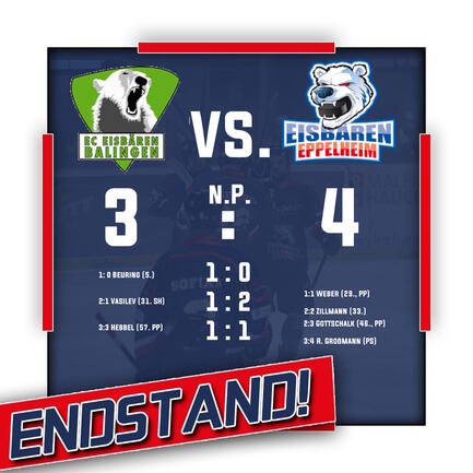 Im erwartet engen Rückspiel gegen die Balinger Artgenossen sind die Eisbären mit einem blauen Auge davon gekommen. Nach zweimaligem Rückstand konnte man die Partie durch die Tore von Weber, Zillmann, Gottschalk und R. Großmann drehen und am Ende mit dem 4:3-Penaltysieg auch das Rückspiel für sich entscheiden und so die Tabellenführung verteidigen